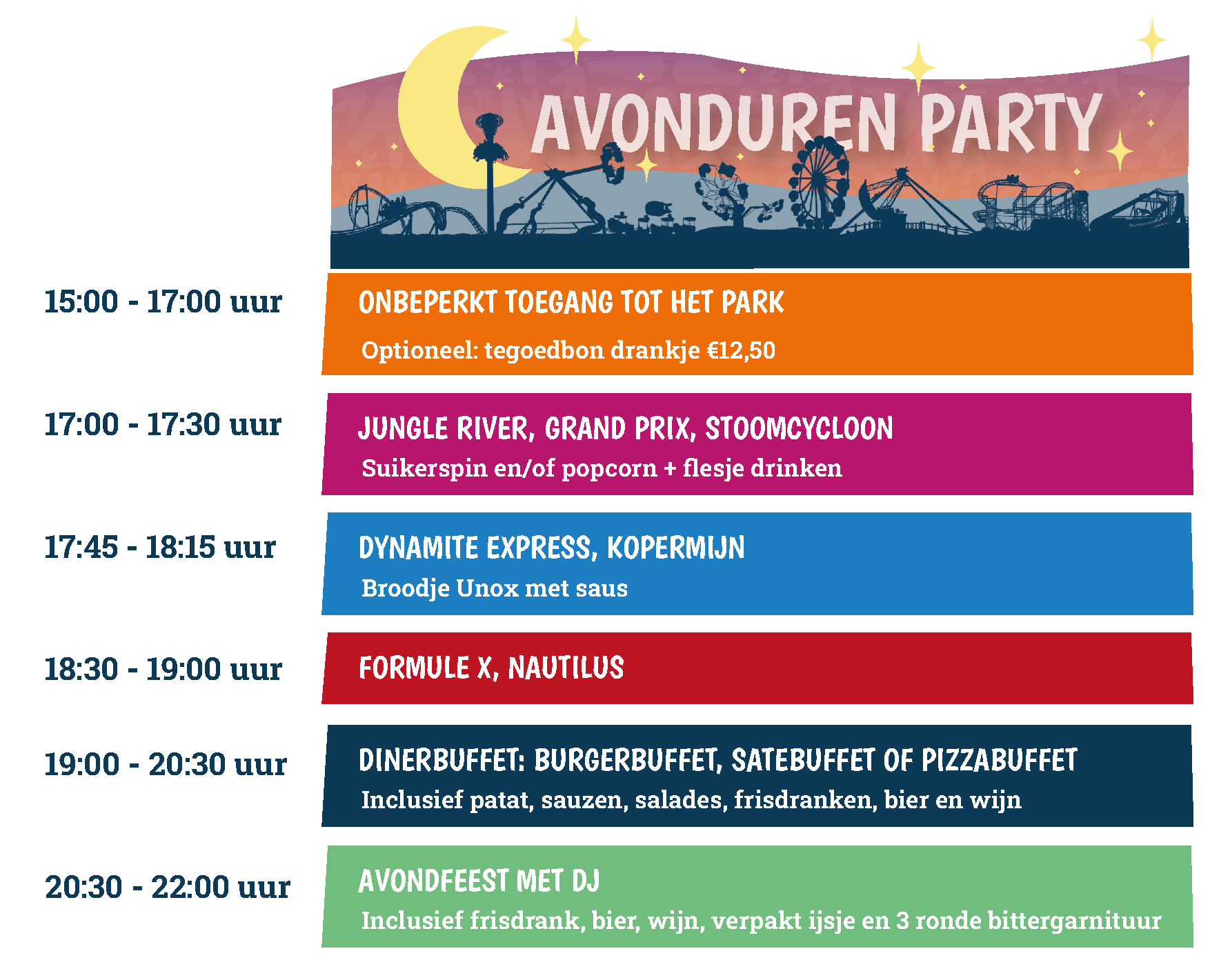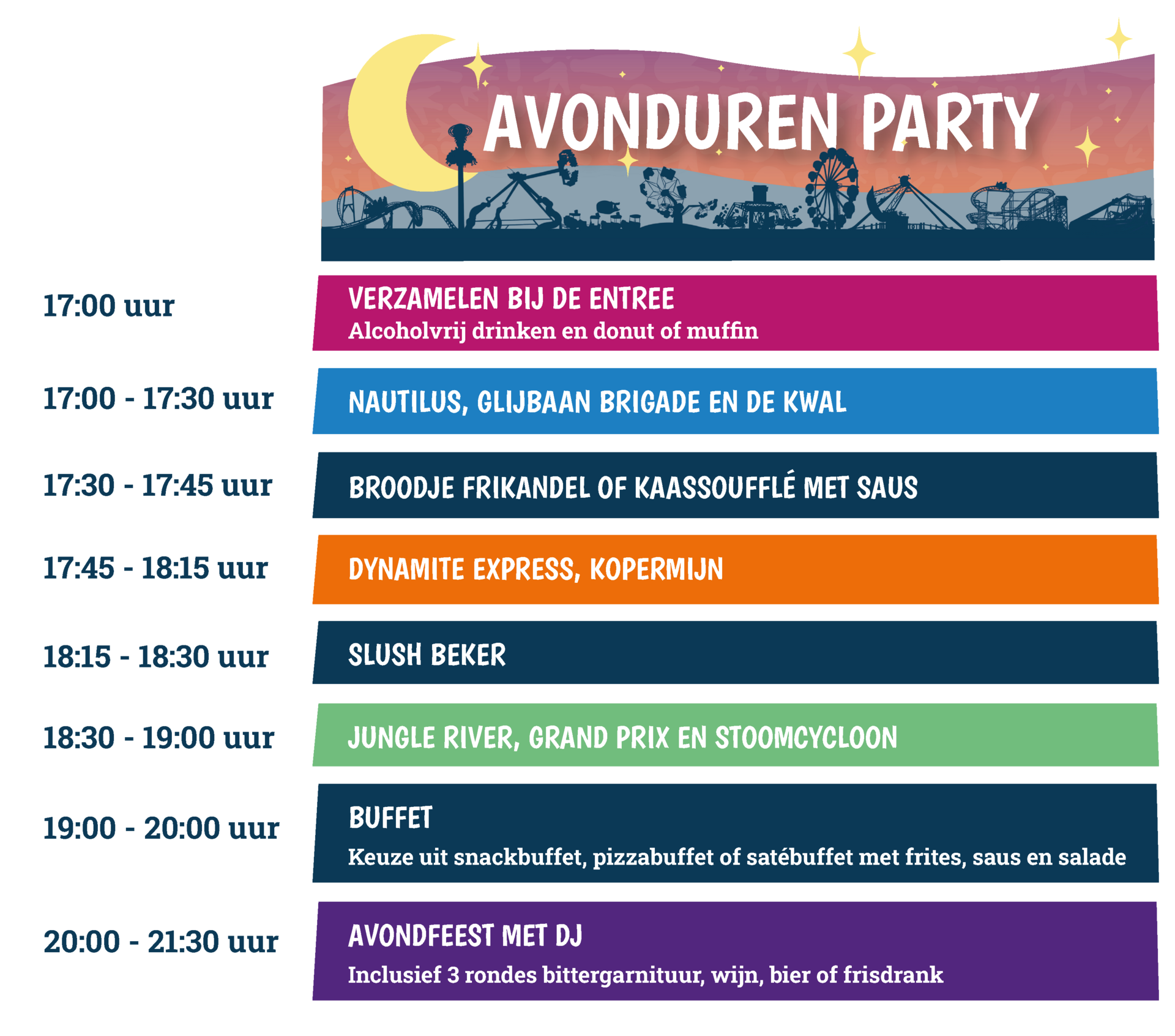 Geniet van een ontspannen borrel, een heerlijk buffet naar keuze en volop entertainment. Stap nog één keer in een aantal favoriete attracties, proost met collega’s en dans de avond weg op de muziek van onze DJ.